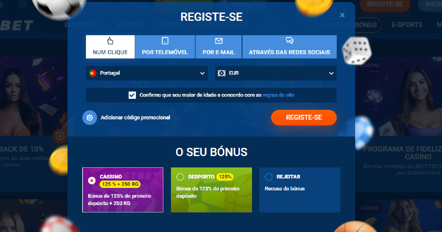 Para solicitar bônus de depósito na Mostbet cassino, o processo é simples e fácil. Logo ao se cadastrar, você já pode escolher a melhor oferta para começar suas apostas com o pé direito. Durante o registro, basta preencher seus dados pessoais e, em seguida, decidir se prefere o bônus de cassino, que oferece 125% mais 250 rodadas grátis, ou o de apostas esportivas, com 125% no primeiro depósito.